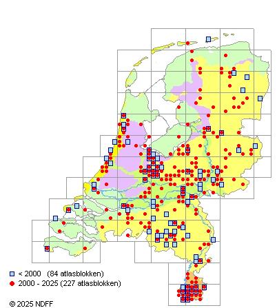 Het aantal atlasblokken (5x5 km) waarin de soort is gemeld binnen een periode van vijf jaar (vanaf 1980) of twintig jaar. Niet gecorrigeerd voor waarnemersinspanning en het aantal doorgegeven waarnemingen kan sterk variëren per periode, dus een trend in verspreiding kan hier niet direct uit worden afgelezen. Het opgegeven jaartal is het eerste jaar van de periode. Bron: gevalideerde waarnemingen uit de NDFF.