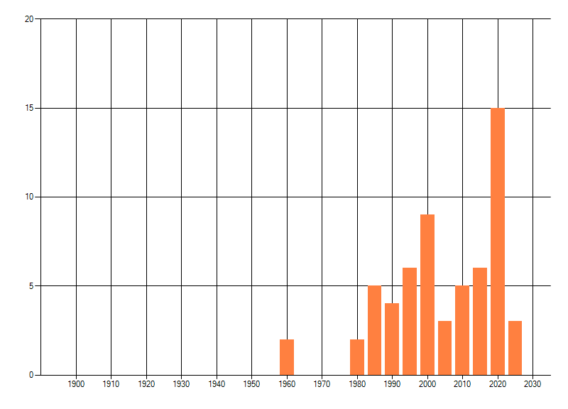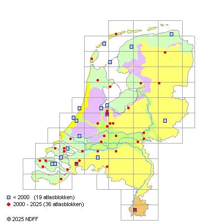 Het aantal atlasblokken (5x5 km) waarin de soort is gemeld binnen een periode van vijf jaar (vanaf 1980) of twintig jaar. Niet gecorrigeerd voor waarnemersinspanning en het aantal doorgegeven waarnemingen kan sterk variëren per periode, dus een trend in verspreiding kan hier niet direct uit worden afgelezen. Het opgegeven jaartal is het eerste jaar van de periode. Bron: gevalideerde waarnemingen uit de NDFF.