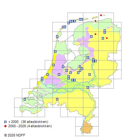 Het geschatte aantal atlasblokken (5x5 km) waarin de soort voorkomt per periode van vijf jaar. Bron: A. Aptroot et al. Basisrapport Rode Lijst Korstmossen 2011 © BLWG 2012.