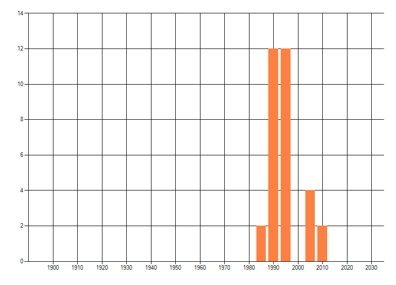 Het aantal atlasblokken (5x5 km) waarin de soort is gemeld binnen een periode van vijf jaar (vanaf 1980) of twintig jaar. Niet gecorrigeerd voor waarnemersinspanning en het aantal doorgegeven waarnemingen kan sterk variëren per periode, dus een trend in verspreiding kan hier niet direct uit worden afgelezen. Het opgegeven jaartal is het eerste jaar van de periode. Bron: gevalideerde waarnemingen uit de NDFF.
