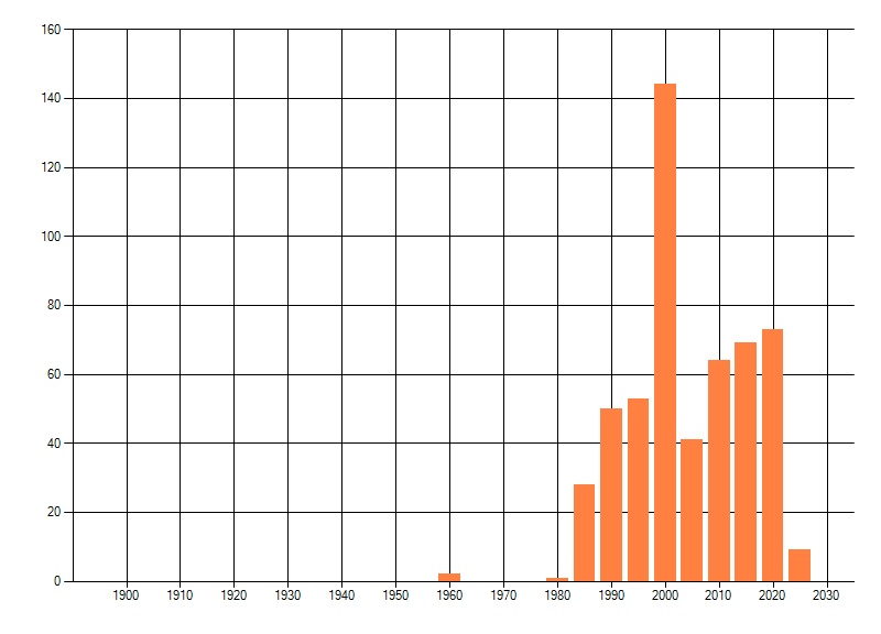 Het aantal atlasblokken (5x5 km) waarin de soort is gemeld binnen een periode van vijf jaar (vanaf 1980) of twintig jaar. Niet gecorrigeerd voor waarnemersinspanning en het aantal doorgegeven waarnemingen kan sterk variƫren per periode, dus een trend in verspreiding kan hier niet direct uit worden afgelezen. Het opgegeven jaartal is het eerste jaar van de periode. Bron: gevalideerde waarnemingen uit de NDFF.