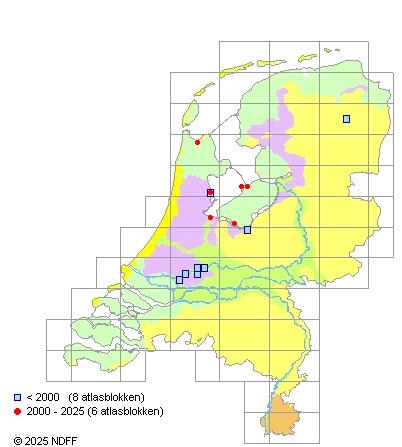 Het aantal atlasblokken (5x5 km) waarin de soort is gemeld binnen een periode van vijf jaar (vanaf 1980) of twintig jaar. Niet gecorrigeerd voor waarnemersinspanning en het aantal doorgegeven waarnemingen kan sterk variëren per periode, dus een trend in verspreiding kan hier niet direct uit worden afgelezen. Het opgegeven jaartal is het eerste jaar van de periode. Bron: gevalideerde waarnemingen uit de NDFF.