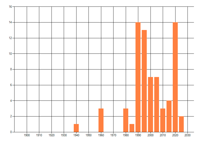 Het aantal atlasblokken (5x5 km) waarin de soort is gemeld binnen een periode van vijf jaar (vanaf 1980) of twintig jaar. Niet gecorrigeerd voor waarnemersinspanning en het aantal doorgegeven waarnemingen kan sterk variëren per periode, dus een trend in verspreiding kan hier niet direct uit worden afgelezen. Het opgegeven jaartal is het eerste jaar van de periode. Bron: gevalideerde waarnemingen uit de NDFF.