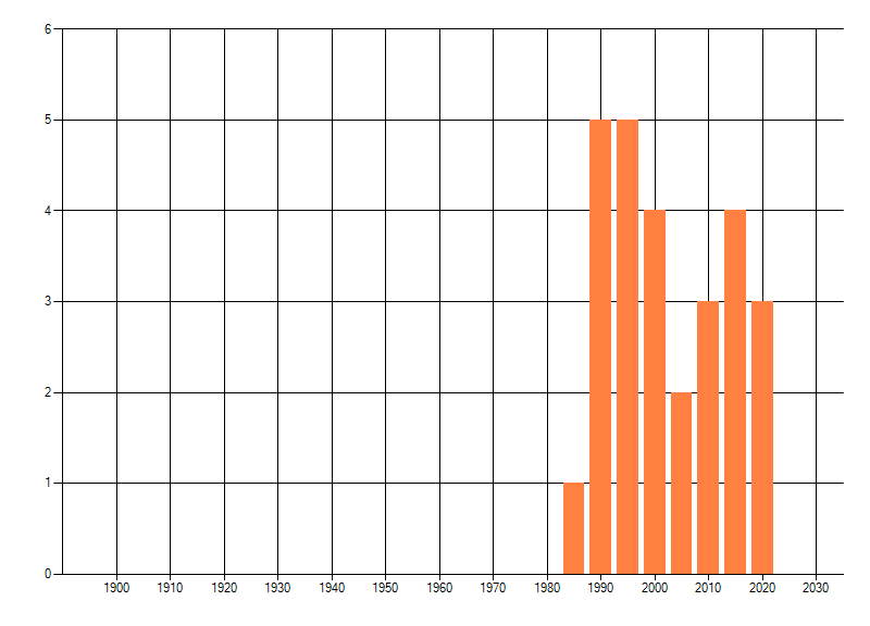 Het aantal atlasblokken (5x5 km) waarin de soort is gemeld binnen een periode van vijf jaar (vanaf 1980) of twintig jaar. Niet gecorrigeerd voor waarnemersinspanning en het aantal doorgegeven waarnemingen kan sterk variëren per periode, dus een trend in verspreiding kan hier niet direct uit worden afgelezen. Het opgegeven jaartal is het eerste jaar van de periode. Bron: gevalideerde waarnemingen uit de NDFF.