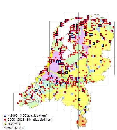 Het aantal atlasblokken (5x5 km) waarin de soort is gemeld binnen een periode van vijf jaar (vanaf 1980) of twintig jaar. Niet gecorrigeerd voor waarnemersinspanning en het aantal doorgegeven waarnemingen kan sterk variƫren per periode, dus een trend in verspreiding kan hier niet direct uit worden afgelezen. Het opgegeven jaartal is het eerste jaar van de periode. Bron: gevalideerde waarnemingen uit de NDFF.