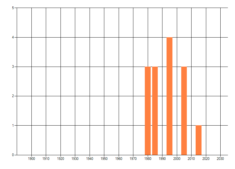 Het aantal atlasblokken (5x5 km) waarin de soort is gemeld binnen een periode van vijf jaar (vanaf 1980) of twintig jaar. Niet gecorrigeerd voor waarnemersinspanning en het aantal doorgegeven waarnemingen kan sterk variëren per periode, dus een trend in verspreiding kan hier niet direct uit worden afgelezen. Het opgegeven jaartal is het eerste jaar van de periode. Bron: gevalideerde waarnemingen uit de NDFF.