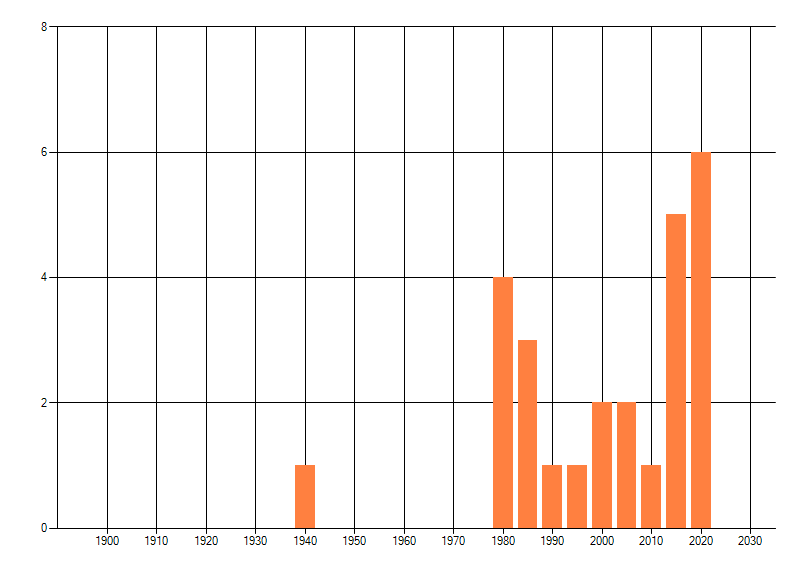 Het aantal atlasblokken (5x5 km) waarin de soort is gemeld binnen een periode van vijf jaar (vanaf 1980) of twintig jaar. Niet gecorrigeerd voor waarnemersinspanning en het aantal doorgegeven waarnemingen kan sterk variëren per periode, dus een trend in verspreiding kan hier niet direct uit worden afgelezen. Het opgegeven jaartal is het eerste jaar van de periode. Bron: gevalideerde waarnemingen uit de NDFF.