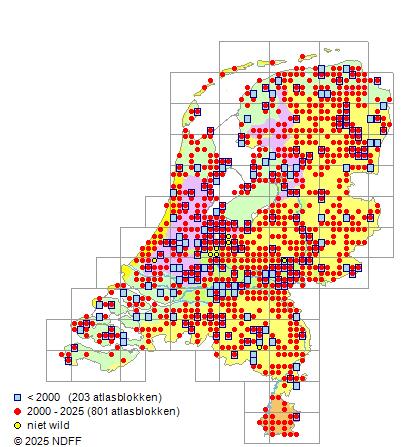 Het geschatte aantal atlasblokken (5x5 km) waarin de soort voorkomt per periode van vijf jaar. Bron: A. Aptroot et al. Basisrapport Rode Lijst Korstmossen 2011 © BLWG 2012.