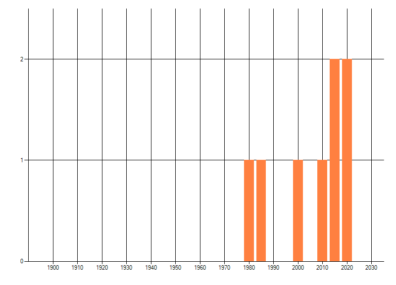 Het aantal atlasblokken (5x5 km) waarin de soort is gemeld binnen een periode van vijf jaar (vanaf 1980) of twintig jaar. Niet gecorrigeerd voor waarnemersinspanning en het aantal doorgegeven waarnemingen kan sterk variëren per periode, dus een trend in verspreiding kan hier niet direct uit worden afgelezen. Het opgegeven jaartal is het eerste jaar van de periode. Bron: gevalideerde waarnemingen uit de NDFF.