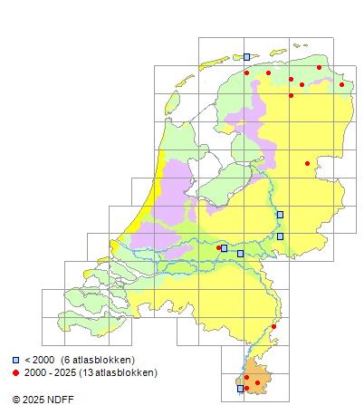 Het aantal atlasblokken (5x5 km) waarin de soort is gemeld binnen een periode van vijf jaar (vanaf 1980) of twintig jaar. Niet gecorrigeerd voor waarnemersinspanning en het aantal doorgegeven waarnemingen kan sterk variëren per periode, dus een trend in verspreiding kan hier niet direct uit worden afgelezen. Het opgegeven jaartal is het eerste jaar van de periode. Bron: gevalideerde waarnemingen uit de NDFF.