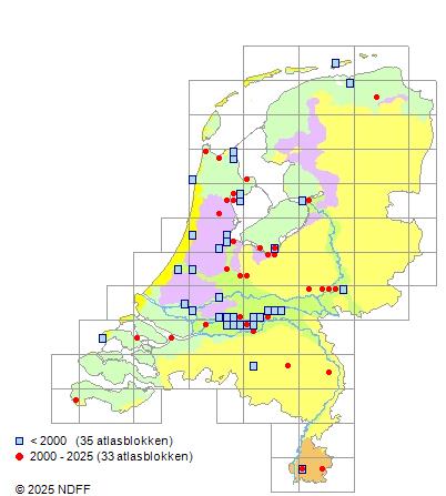 Het aantal atlasblokken (5x5 km) waarin de soort is gemeld binnen een periode van vijf jaar (vanaf 1980) of twintig jaar. Niet gecorrigeerd voor waarnemersinspanning en het aantal doorgegeven waarnemingen kan sterk variëren per periode, dus een trend in verspreiding kan hier niet direct uit worden afgelezen. Het opgegeven jaartal is het eerste jaar van de periode. Bron: gevalideerde waarnemingen uit de NDFF.