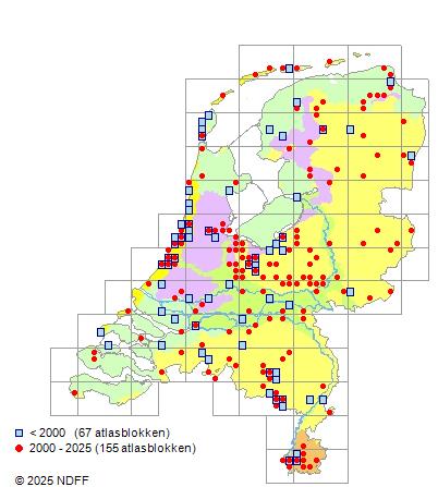 Het aantal atlasblokken (5x5 km) waarin de soort is gemeld binnen een periode van vijf jaar (vanaf 1980) of twintig jaar. Niet gecorrigeerd voor waarnemersinspanning en het aantal doorgegeven waarnemingen kan sterk variëren per periode, dus een trend in verspreiding kan hier niet direct uit worden afgelezen. Het opgegeven jaartal is het eerste jaar van de periode. Bron: gevalideerde waarnemingen uit de NDFF.