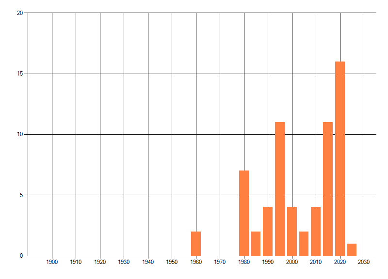Het aantal atlasblokken (5x5 km) waarin de soort is gemeld binnen een periode van vijf jaar (vanaf 1980) of twintig jaar. Niet gecorrigeerd voor waarnemersinspanning en het aantal doorgegeven waarnemingen kan sterk variëren per periode, dus een trend in verspreiding kan hier niet direct uit worden afgelezen. Het opgegeven jaartal is het eerste jaar van de periode. Bron: gevalideerde waarnemingen uit de NDFF.