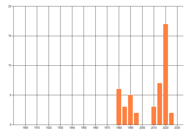 Het aantal atlasblokken (5x5 km) waarin de soort is gemeld binnen een periode van vijf jaar (vanaf 1980) of twintig jaar. Niet gecorrigeerd voor waarnemersinspanning en het aantal doorgegeven waarnemingen kan sterk variëren per periode, dus een trend in verspreiding kan hier niet direct uit worden afgelezen. Het opgegeven jaartal is het eerste jaar van de periode. Bron: gevalideerde waarnemingen uit de NDFF.