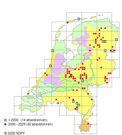 Het aantal atlasblokken (5x5 km) waarin de soort is gemeld binnen een periode van vijf jaar (vanaf 1980) of twintig jaar. Niet gecorrigeerd voor waarnemersinspanning en het aantal doorgegeven waarnemingen kan sterk variëren per periode, dus een trend in verspreiding kan hier niet direct uit worden afgelezen. Het opgegeven jaartal is het eerste jaar van de periode. Bron: gevalideerde waarnemingen uit de NDFF.