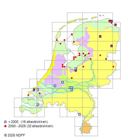 Het aantal atlasblokken (5x5 km) waarin de soort is gemeld binnen een periode van vijf jaar (vanaf 1980) of twintig jaar. Niet gecorrigeerd voor waarnemersinspanning en het aantal doorgegeven waarnemingen kan sterk variëren per periode, dus een trend in verspreiding kan hier niet direct uit worden afgelezen. Het opgegeven jaartal is het eerste jaar van de periode. Bron: gevalideerde waarnemingen uit de NDFF.