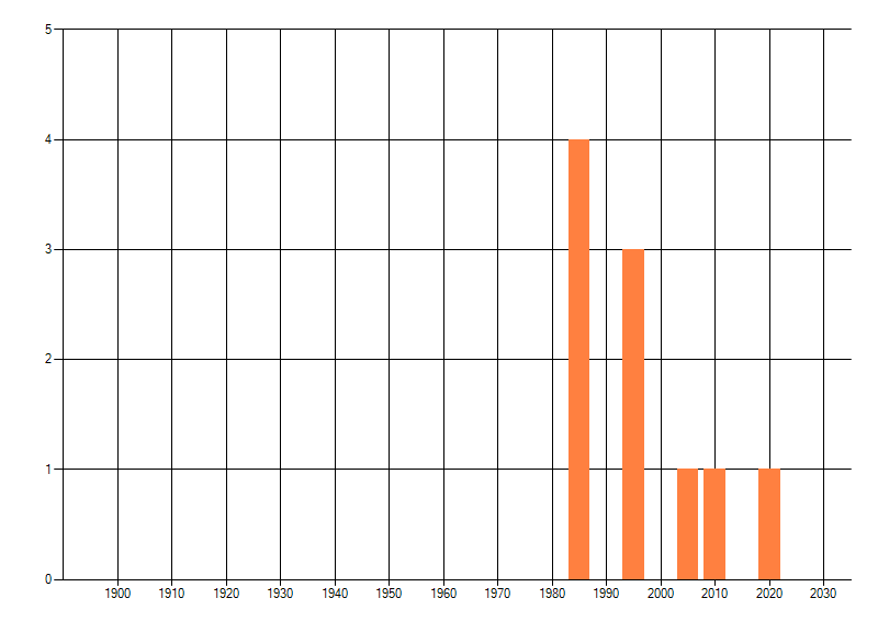 Het aantal atlasblokken (5x5 km) waarin de soort is gemeld binnen een periode van vijf jaar (vanaf 1980) of twintig jaar. Niet gecorrigeerd voor waarnemersinspanning en het aantal doorgegeven waarnemingen kan sterk variëren per periode, dus een trend in verspreiding kan hier niet direct uit worden afgelezen. Het opgegeven jaartal is het eerste jaar van de periode. Bron: gevalideerde waarnemingen uit de NDFF.