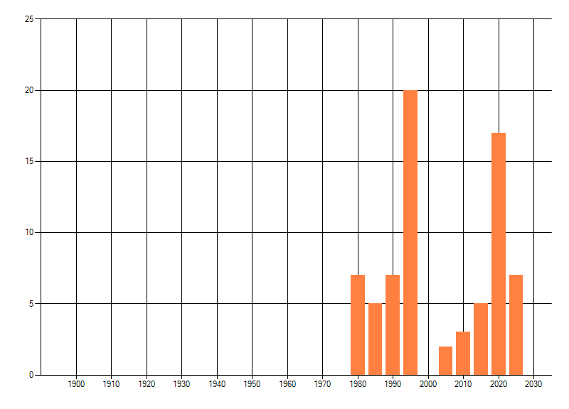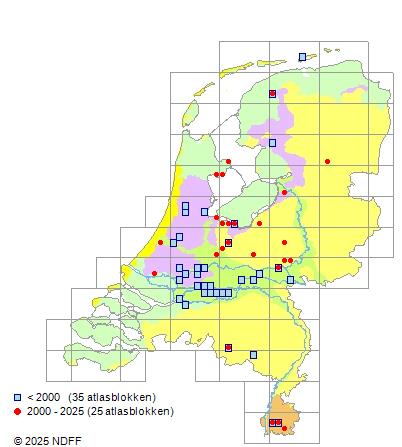 Het aantal atlasblokken (5x5 km) waarin de soort is gemeld binnen een periode van vijf jaar (vanaf 1980) of twintig jaar. Niet gecorrigeerd voor waarnemersinspanning en het aantal doorgegeven waarnemingen kan sterk variëren per periode, dus een trend in verspreiding kan hier niet direct uit worden afgelezen. Het opgegeven jaartal is het eerste jaar van de periode. Bron: gevalideerde waarnemingen uit de NDFF.