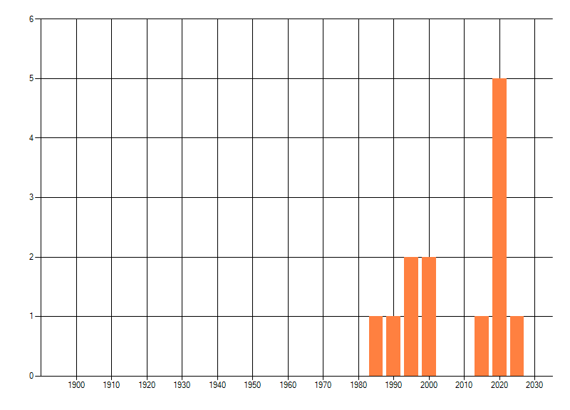 Het aantal atlasblokken (5x5 km) waarin de soort is gemeld binnen een periode van vijf jaar (vanaf 1980) of twintig jaar. Niet gecorrigeerd voor waarnemersinspanning en het aantal doorgegeven waarnemingen kan sterk variëren per periode, dus een trend in verspreiding kan hier niet direct uit worden afgelezen. Het opgegeven jaartal is het eerste jaar van de periode. Bron: gevalideerde waarnemingen uit de NDFF.