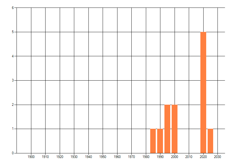 Het aantal atlasblokken (5x5 km) waarin de soort is gemeld binnen een periode van vijf jaar (vanaf 1980) of twintig jaar. Niet gecorrigeerd voor waarnemersinspanning en het aantal doorgegeven waarnemingen kan sterk variëren per periode, dus een trend in verspreiding kan hier niet direct uit worden afgelezen. Het opgegeven jaartal is het eerste jaar van de periode. Bron: gevalideerde waarnemingen uit de NDFF.