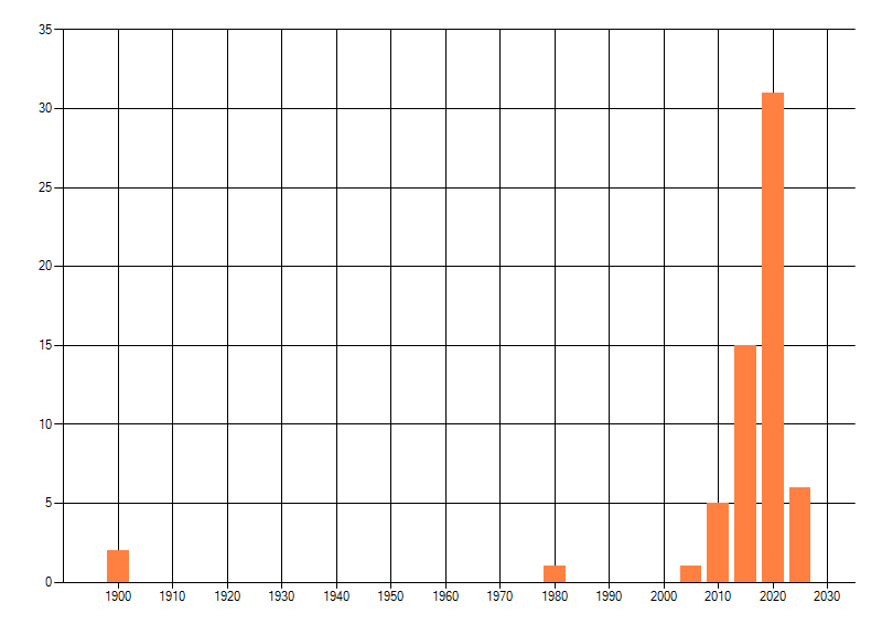 Het aantal atlasblokken (5x5 km) waarin de soort is gemeld binnen een periode van vijf jaar (vanaf 1980) of twintig jaar. Niet gecorrigeerd voor waarnemersinspanning en het aantal doorgegeven waarnemingen kan sterk variëren per periode, dus een trend in verspreiding kan hier niet direct uit worden afgelezen. Het opgegeven jaartal is het eerste jaar van de periode. Bron: gevalideerde waarnemingen uit de NDFF.