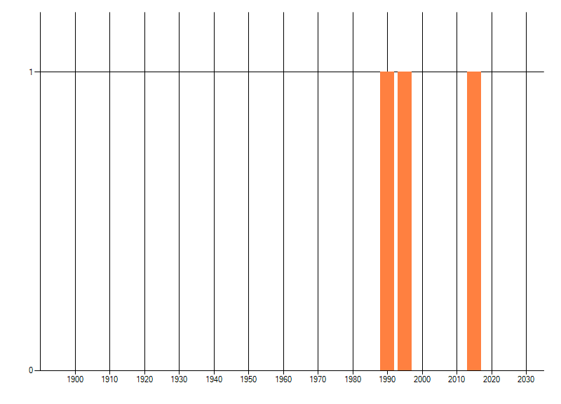 Het aantal atlasblokken (5x5 km) waarin de soort is gemeld binnen een periode van vijf jaar (vanaf 1980) of twintig jaar. Niet gecorrigeerd voor waarnemersinspanning en het aantal doorgegeven waarnemingen kan sterk variëren per periode, dus een trend in verspreiding kan hier niet direct uit worden afgelezen. Het opgegeven jaartal is het eerste jaar van de periode. Bron: gevalideerde waarnemingen uit de NDFF.