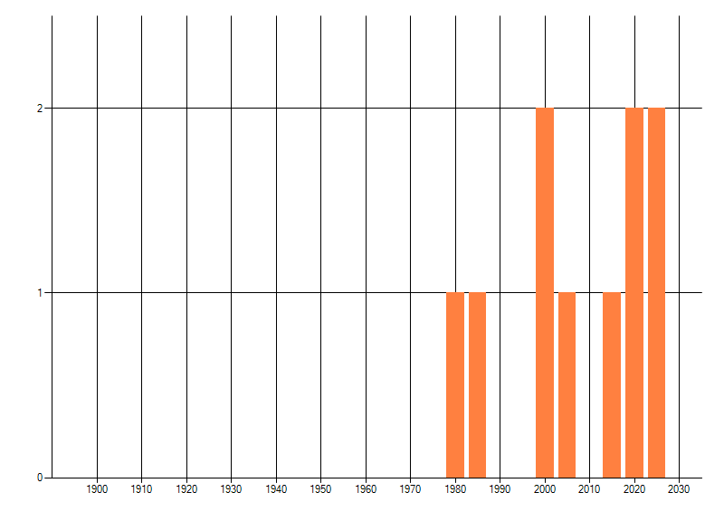 Het aantal atlasblokken (5x5 km) waarin de soort is gemeld binnen een periode van vijf jaar (vanaf 1980) of twintig jaar. Niet gecorrigeerd voor waarnemersinspanning en het aantal doorgegeven waarnemingen kan sterk variëren per periode, dus een trend in verspreiding kan hier niet direct uit worden afgelezen. Het opgegeven jaartal is het eerste jaar van de periode. Bron: gevalideerde waarnemingen uit de NDFF.
