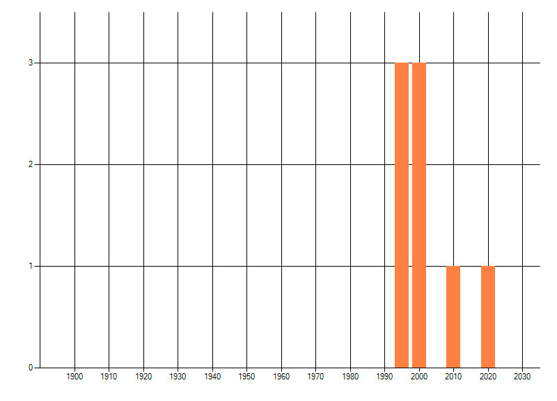 Het aantal atlasblokken (5x5 km) waarin de soort is gemeld binnen een periode van vijf jaar (vanaf 1980) of twintig jaar. Niet gecorrigeerd voor waarnemersinspanning en het aantal doorgegeven waarnemingen kan sterk variëren per periode, dus een trend in verspreiding kan hier niet direct uit worden afgelezen. Het opgegeven jaartal is het eerste jaar van de periode. Bron: gevalideerde waarnemingen uit de NDFF.