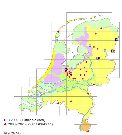 Het aantal atlasblokken (5x5 km) waarin de soort is gemeld binnen een periode van vijf jaar (vanaf 1980) of twintig jaar.