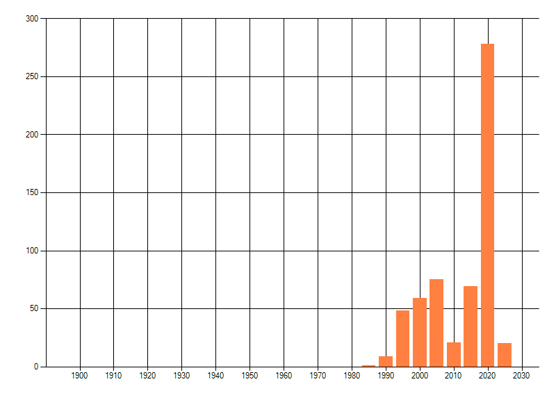 Het aantal atlasblokken (5x5 km) waarin de soort is gemeld binnen een periode van vijf jaar (vanaf 1980) of twintig jaar. Niet gecorrigeerd voor waarnemersinspanning en het aantal doorgegeven waarnemingen kan sterk variëren per periode, dus een trend in verspreiding kan hier niet direct uit worden afgelezen. Het opgegeven jaartal is het eerste jaar van de periode. Bron: gevalideerde waarnemingen uit de NDFF.