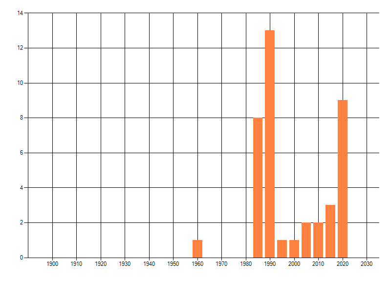 Het aantal atlasblokken (5x5 km) waarin de soort is gemeld binnen een periode van vijf jaar (vanaf 1980) of twintig jaar. Niet gecorrigeerd voor waarnemersinspanning en het aantal doorgegeven waarnemingen kan sterk variëren per periode, dus een trend in verspreiding kan hier niet direct uit worden afgelezen. Het opgegeven jaartal is het eerste jaar van de periode. Bron: gevalideerde waarnemingen uit de NDFF.