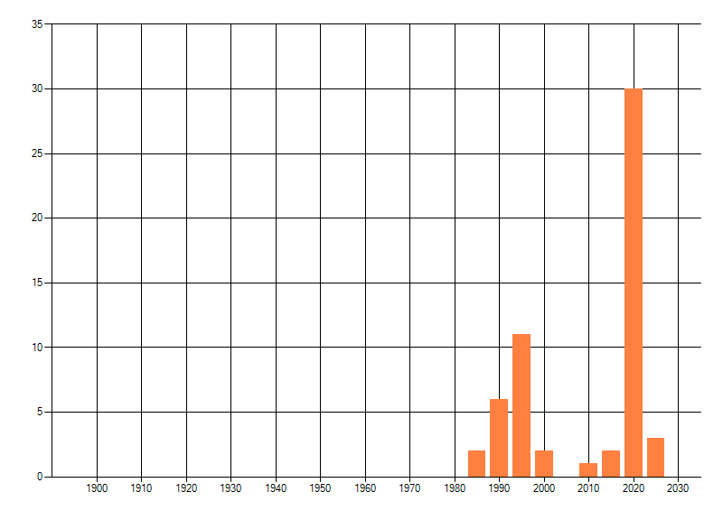 Het aantal atlasblokken (5x5 km) waarin de soort is gemeld binnen een periode van vijf jaar (vanaf 1980) of twintig jaar. Niet gecorrigeerd voor waarnemersinspanning en het aantal doorgegeven waarnemingen kan sterk variëren per periode, dus een trend in verspreiding kan hier niet direct uit worden afgelezen. Het opgegeven jaartal is het eerste jaar van de periode. Bron: gevalideerde waarnemingen uit de NDFF.