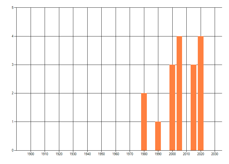 Het aantal atlasblokken (5x5 km) waarin de soort is gemeld binnen een periode van vijf jaar (vanaf 1980) of twintig jaar. Niet gecorrigeerd voor waarnemersinspanning en het aantal doorgegeven waarnemingen kan sterk variëren per periode, dus een trend in verspreiding kan hier niet direct uit worden afgelezen. Het opgegeven jaartal is het eerste jaar van de periode. Bron: gevalideerde waarnemingen uit de NDFF.