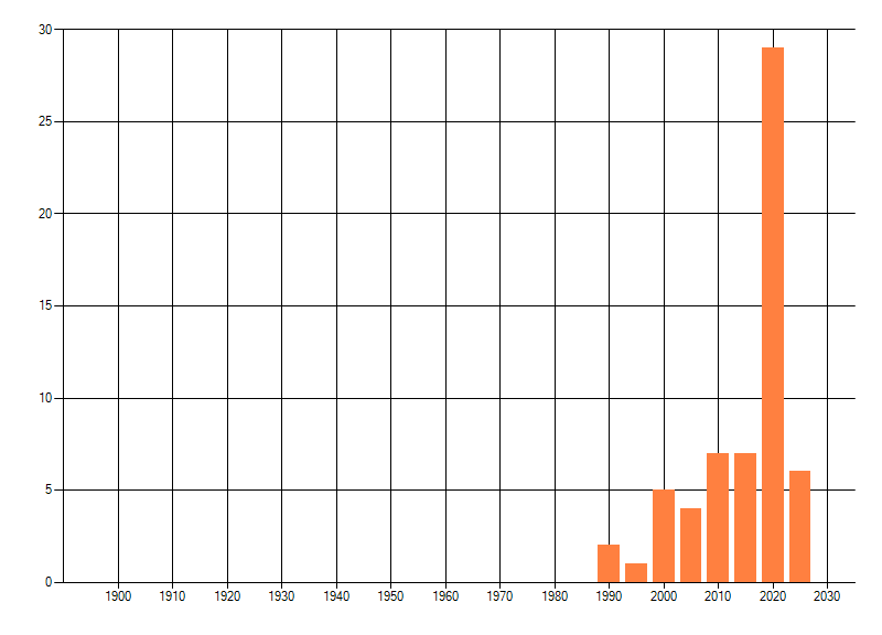 Het aantal atlasblokken (5x5 km) waarin de soort is gemeld binnen een periode van vijf jaar (vanaf 1980) of twintig jaar. Niet gecorrigeerd voor waarnemersinspanning en het aantal doorgegeven waarnemingen kan sterk variëren per periode, dus een trend in verspreiding kan hier niet direct uit worden afgelezen. Het opgegeven jaartal is het eerste jaar van de periode. Bron: gevalideerde waarnemingen uit de NDFF.