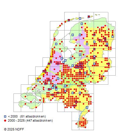 Het aantal atlasblokken (5x5 km) waarin de soort is gemeld binnen een periode van vijf jaar (vanaf 1980) of twintig jaar. Niet gecorrigeerd voor waarnemersinspanning en het aantal doorgegeven waarnemingen kan sterk variëren per periode, dus een trend in verspreiding kan hier niet direct uit worden afgelezen. Het opgegeven jaartal is het eerste jaar van de periode. Bron: gevalideerde waarnemingen uit de NDFF.