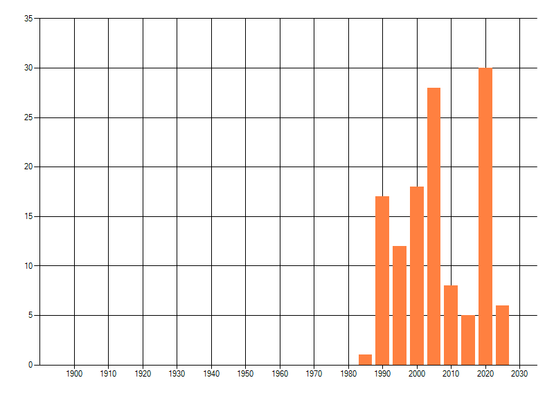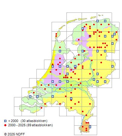 Het aantal atlasblokken (5x5 km) waarin de soort is gemeld binnen een periode van vijf jaar (vanaf 1980) of twintig jaar. Niet gecorrigeerd voor waarnemersinspanning en het aantal doorgegeven waarnemingen kan sterk variëren per periode, dus een trend in verspreiding kan hier niet direct uit worden afgelezen. Het opgegeven jaartal is het eerste jaar van de periode. Bron: gevalideerde waarnemingen uit de NDFF.