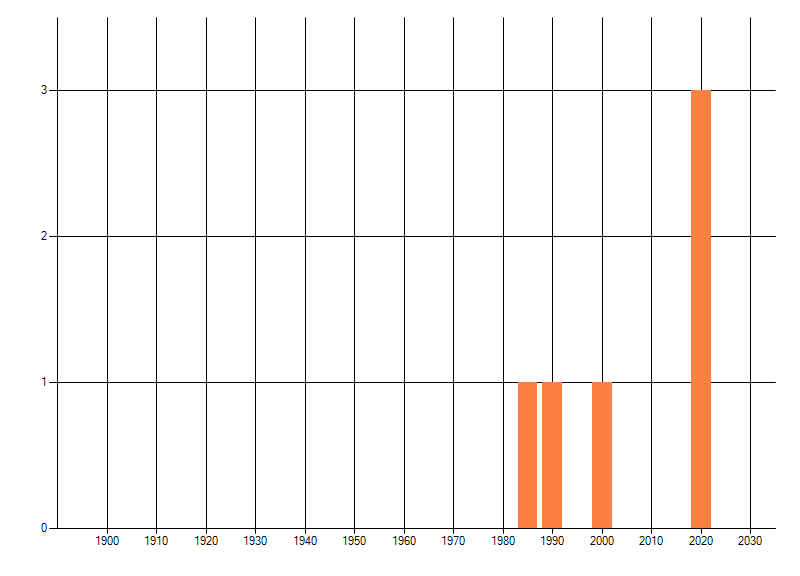 Het aantal atlasblokken (5x5 km) waarin de soort is gemeld binnen een periode van vijf jaar (vanaf 1980) of twintig jaar. Niet gecorrigeerd voor waarnemersinspanning en het aantal doorgegeven waarnemingen kan sterk variëren per periode, dus een trend in verspreiding kan hier niet direct uit worden afgelezen. Het opgegeven jaartal is het eerste jaar van de periode. Bron: gevalideerde waarnemingen uit de NDFF.