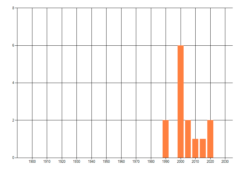 Het aantal atlasblokken (5x5 km) waarin de soort is gemeld binnen een periode van vijf jaar (vanaf 1980) of twintig jaar. Niet gecorrigeerd voor waarnemersinspanning en het aantal doorgegeven waarnemingen kan sterk variëren per periode, dus een trend in verspreiding kan hier niet direct uit worden afgelezen. Het opgegeven jaartal is het eerste jaar van de periode. Bron: gevalideerde waarnemingen uit de NDFF.