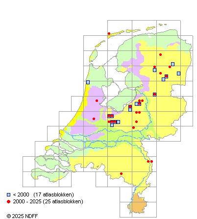 Het aantal atlasblokken (5x5 km) waarin de soort is gemeld binnen een periode van vijf jaar (vanaf 1980) of twintig jaar. Niet gecorrigeerd voor waarnemersinspanning en het aantal doorgegeven waarnemingen kan sterk variëren per periode, dus een trend in verspreiding kan hier niet direct uit worden afgelezen. Het opgegeven jaartal is het eerste jaar van de periode. Bron: gevalideerde waarnemingen uit de NDFF.