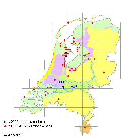 Het aantal atlasblokken (5x5 km) waarin de soort is gemeld binnen een periode van vijf jaar (vanaf 1980) of twintig jaar. Niet gecorrigeerd voor waarnemersinspanning en het aantal doorgegeven waarnemingen kan sterk variëren per periode, dus een trend in verspreiding kan hier niet direct uit worden afgelezen. Het opgegeven jaartal is het eerste jaar van de periode. Bron: gevalideerde waarnemingen uit de NDFF.
