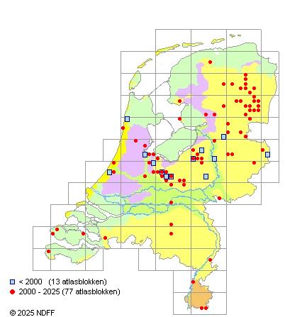 Het aantal atlasblokken (5x5 km) waarin de soort is gemeld binnen een periode van vijf jaar (vanaf 1980) of twintig jaar. Niet gecorrigeerd voor waarnemersinspanning en het aantal doorgegeven waarnemingen kan sterk variëren per periode, dus een trend in verspreiding kan hier niet direct uit worden afgelezen. Het opgegeven jaartal is het eerste jaar van de periode. Bron: gevalideerde waarnemingen uit de NDFF.