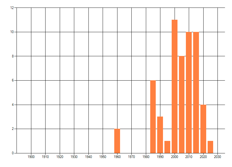 Het aantal atlasblokken (5x5 km) waarin de soort is gemeld binnen een periode van vijf jaar (vanaf 1980) of twintig jaar. Niet gecorrigeerd voor waarnemersinspanning en het aantal doorgegeven waarnemingen kan sterk variëren per periode, dus een trend in verspreiding kan hier niet direct uit worden afgelezen. Het opgegeven jaartal is het eerste jaar van de periode. Bron: gevalideerde waarnemingen uit de NDFF.