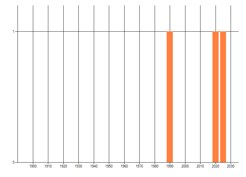 Het aantal atlasblokken (5x5 km) waarin de soort is gemeld binnen een periode van vijf jaar (vanaf 1980) of twintig jaar. Niet gecorrigeerd voor waarnemersinspanning en het aantal doorgegeven waarnemingen kan sterk variëren per periode, dus een trend in verspreiding kan hier niet direct uit worden afgelezen. Het opgegeven jaartal is het eerste jaar van de periode. Bron: gevalideerde waarnemingen uit de NDFF.