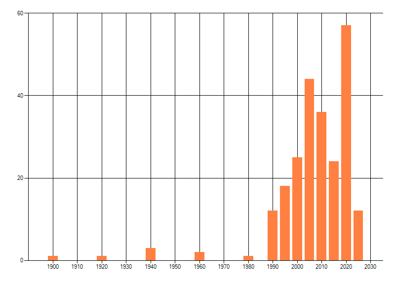Het aantal atlasblokken (5x5 km) waarin de soort is gemeld binnen een periode van vijf jaar (vanaf 1980) of twintig jaar. Niet gecorrigeerd voor waarnemersinspanning en het aantal doorgegeven waarnemingen kan sterk variëren per periode, dus een trend in verspreiding kan hier niet direct uit worden afgelezen. Het opgegeven jaartal is het eerste jaar van de periode. Bron: gevalideerde waarnemingen uit de NDFF.