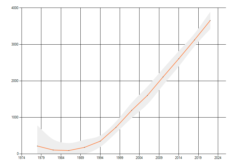 In de grafiek correspondeert ieder punt met het laatste jaar van zo'n periode.