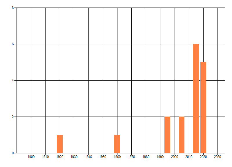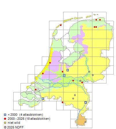 Het aantal atlasblokken (5x5 km) waarin de soort is gemeld binnen een periode van vijf jaar (vanaf 1980) of twintig jaar. Niet gecorrigeerd voor waarnemersinspanning en het aantal doorgegeven waarnemingen kan sterk variëren per periode, dus een trend in verspreiding kan hier niet direct uit worden afgelezen. Het opgegeven jaartal is het eerste jaar van de periode. Bron: gevalideerde waarnemingen uit de NDFF.