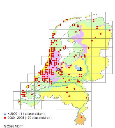Het aantal atlasblokken (5x5 km) waarin de soort is gemeld binnen een periode van vijf jaar (vanaf 1980) of twintig jaar. Niet gecorrigeerd voor waarnemersinspanning en het aantal doorgegeven waarnemingen kan sterk variëren per periode, dus een trend in verspreiding kan hier niet direct uit worden afgelezen. Het opgegeven jaartal is het eerste jaar van de periode. Bron: gevalideerde waarnemingen uit de NDFF.