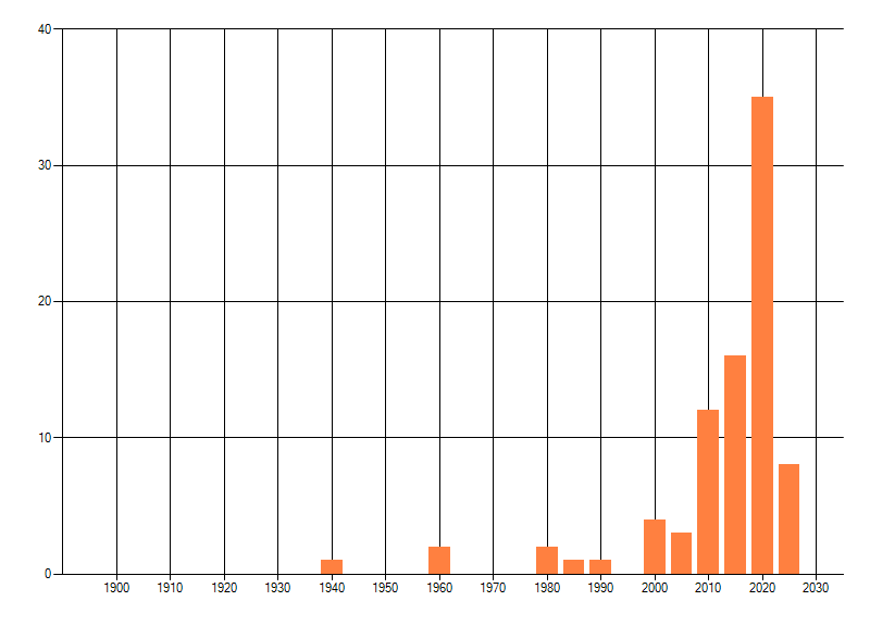 Het aantal atlasblokken (5x5 km) waarin de soort is gemeld binnen een periode van vijf jaar (vanaf 1980) of twintig jaar. Niet gecorrigeerd voor waarnemersinspanning en het aantal doorgegeven waarnemingen kan sterk variëren per periode, dus een trend in verspreiding kan hier niet direct uit worden afgelezen. Het opgegeven jaartal is het eerste jaar van de periode. Bron: gevalideerde waarnemingen uit de NDFF.