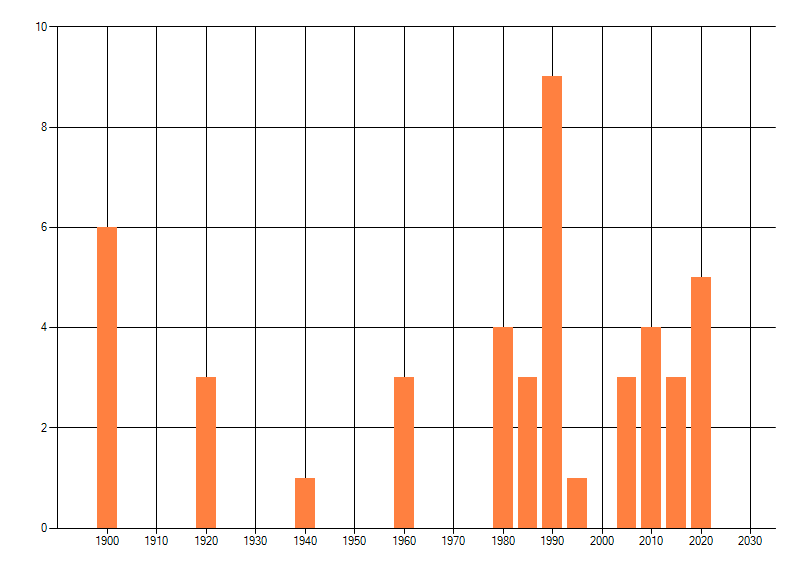 Het aantal atlasblokken (5x5 km) waarin de soort is gemeld binnen een periode van vijf jaar (vanaf 1980) of twintig jaar. Niet gecorrigeerd voor waarnemersinspanning en het aantal doorgegeven waarnemingen kan sterk variëren per periode, dus een trend in verspreiding kan hier niet direct uit worden afgelezen. Het opgegeven jaartal is het eerste jaar van de periode. Bron: gevalideerde waarnemingen uit de NDFF.