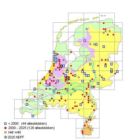 Het aantal atlasblokken (5x5 km) waarin de soort is gemeld binnen een periode van vijf jaar (vanaf 1980) of twintig jaar. Niet gecorrigeerd voor waarnemersinspanning en het aantal doorgegeven waarnemingen kan sterk variëren per periode, dus een trend in verspreiding kan hier niet direct uit worden afgelezen. Het opgegeven jaartal is het eerste jaar van de periode. Bron: gevalideerde waarnemingen uit de NDFF.